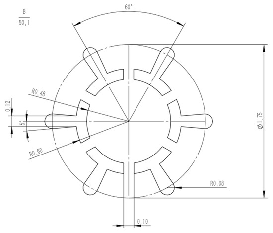 Six-leaf hollow shaped fibres and three-leaf hollow profiled fibres are considered two typical types of shaped fibres, with six-leaf hollow fibres having more blades than three-leaf hollow shaped fibres. Furthermore, the symmetrical distribution of the six-leaf hollow fibre makes them appear more complex. Therefore, in this work, a spinneret with six-leaf hollow micro-hole shapes was designed to study the cross-sectional formation of multi-leaf hollow profiled fibres. The micro-hole shape is shown in Figure 3.
