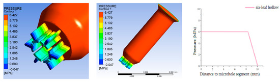 Figure 4 shows the pressure distribution of six-leaf hollow micro-holes. It can be observed that when the melt is in the spinneret channel, the pressure undergoes a decreasing trend along the axis of the channel. It is also found that as the melt approaches the micro-hole segment, the pressure amplitude increases. The spinneret holes have significant impacts on the pressure loss in the channel, as shown in Figure 4.