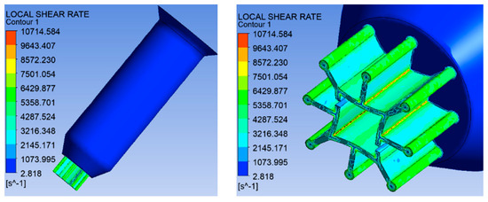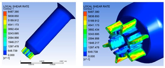 Figure 5 shows the shear rate distribution of six-leaf hollow micro-holes. From Figure 5, it can be observed that the maximum shear rate during melt flow occurs on the microporous wall. In addition, the maximum shear rate of 6487.39 s−1 occurs near the junction of the trapezoidal slits and the end arcs.