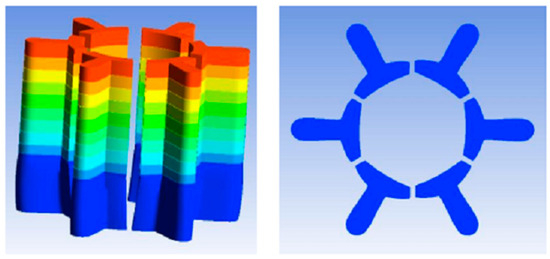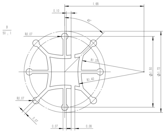 From the results of the stress analyses, it can be observed that when using a single-micro-hole design, the board surface forms a hollow structure and has only one support point. However, the position of the support point will be offset when subjected to high pressure. The maximum displacements of the board surface under these two types of stress are approximately 0.0005445 mm and 0.0005 mm, respectively. This indicates that using only one gap cannot significantly prevent deformation. When the gap dimension was set as 0.08 mm and the lower surface was divided into two and four micro-holes, it was found that the maximum displacement distances were about 0.00009 mm and 0.00005 mm. This is a better effect than was achieved by a single micro-hole in the surface plate. The eight-leaf square hollow spinneret used here has a fineness of 8D and is designed to be composed of two complex units. A schematic diagram of the micro-hole’s design is shown in Figure 12.