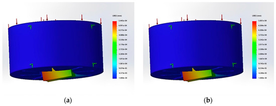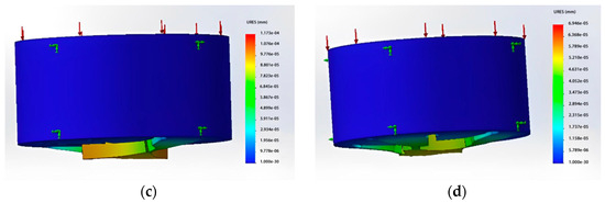 Total displacement results of static stress analysis. (a) The number of gaps is 1, and the gap dimension is 0.08 mm; (b) The number of gaps is 1, and the gap dimension is 0.1 mm; (c) The number of gaps is 2, and the gap dimension is 0.08 mm; (d) The number of gaps is 4, and the gap dimension is 0.08 mm.