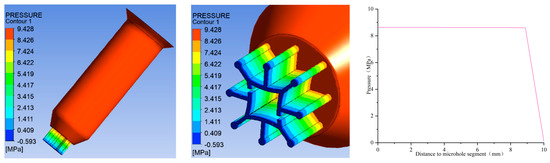 From Figure 13, it can be observed that when the melt flows through the channel of the spinneret, the pressure undergoes a trend of decreasing only along the axis of the channel. The highest value of pressure drop was 9.428 MPa, and the change rate of pressure began to increase as it approached the micro-hole channel.