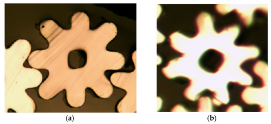 Extrusion swell of eight-leaf square hollow micro-holes. (a) 0.5 mm from the outlet of the spinneret (b) 1 mm from the outlet of the spinneret.