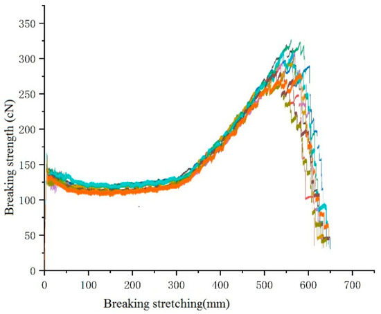Initially, the mechanical properties of the fibres were tested. The spinning process parameters are as follows: The single hole volume flow rate was taken as 3.33 × 10−8 m3/s. The mechanical properties of eight-leaf square hollow fibres with a cooling speed of 0.8m/s were considered. An initial blowing height of 80 mm, a spinning temperature of 285 °C, and a winding speed of 1200 m/min were considered during the testing. The measurement results are shown in Figure 18. Different breaking strength are in different colour, related data and parameters can be seen in Supplementary Material part S2.