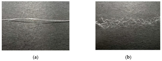 The eight-leaf square hollow profiled fibers did not exhibit a three-dimensional crimp shape after the application of heat setting tension, although they exhibited a slightly bent shape. However, after non-heat setting tension application, they exhibited a three-dimensional crimp shape, as shown in Figure 19.