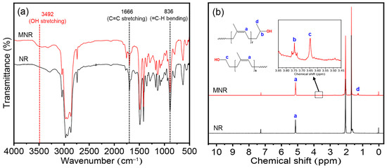 Chemical structure: (a) ATR-FTIR and (b) 1H-NMR spectra of NR and MNR.
