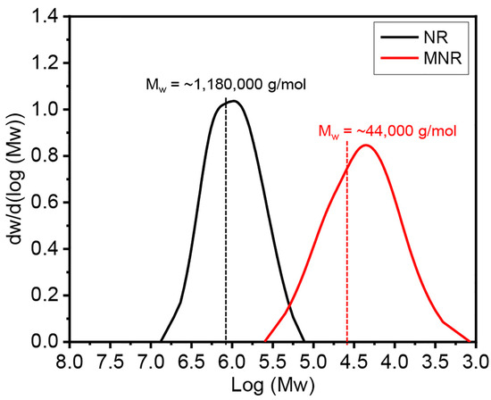 The hydroxyl value of MNR was determined using a titration method according to ASTM D4274 [34]. The calculated result of the hydroxyl value of the MNR was 30.57 ± 2.03 mg KOH/g. Subsequently, the molecular weight of the synthesized MNR was measured using the gel permeation chromatography (GPC) technique, and the distribution curves of the molecular weight of rubber are demonstrated in Figure 4. The finding results reveal that NR has number average molecular weight (Mn) and the weight average molecular weight (Mw) values of approximately 950,000 g/mol and 1,180,000 g/mol, respectively, with a polydispersity index (PDI) of 1.24. The obtained MNR had a molecular weight of approximately 44,000 g/mol (Mn) and 15,000 g/mol (Mw) with a PDI of 2.93. As a result, it can be seen that the modified rubber obtained in this work consisted of the hydroxyl functional group with low molecular weight, resulting in the formation of a light amber sticky rubber-like material, as seen in Figure 1, similar to the previous report by Ibrahim et al. [42].