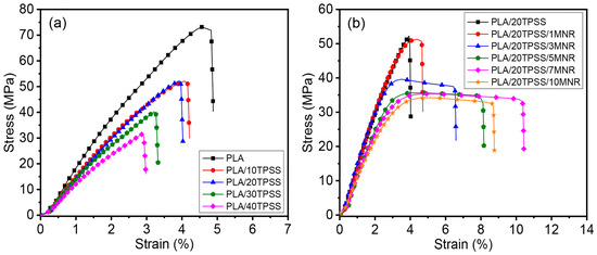 Stress–strain curves of (a) PLA/TPSS binary blends with various TPSS contents and (b) PLA/20TPSS/MNR ternary blends with various MNR contents.
