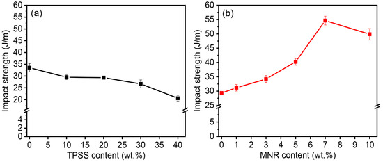 Impact strength of (a) PLA/TPSS binary blends with various TPSS contents and (b) PLA/20TPSS/MNR ternary blends with various MNR contents.