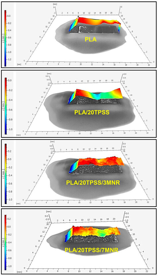 In addition, the improved toughness of the desired material can also be observed from the topography of the crack fracture surface. Generally, increasing the surface irregularity or roughness of the crack fracture indicates the improving interaction between the two or more components of polymer blends and composites, enhancing the mechanical properties of materials, especially impact strength [48,49]. Figure 8, therefore, visualizes the three-dimensional (3D) topographic color maps of the PLA and its blends, observing the surface fracture of the impact-fractured specimens. The fracture process is initiated from a crack tip and continuously propagated throughout the sample after an external load is suddenly applied. The topographic color map of the neat PLA reveals a smooth surface with a similar shade of the high-color scale across the surface fracture, similar to that observed in the SEM images. The addition of TPSS results in a relatively rough surface due to the protruding TPSS granules. The stress penetration during the crack process may probably run through the weak interface between the PLA matrix and the TPSS granules, leading to a deep crack surface consistent with the crack mechanism prediction. Afterwards, the presence of MNR as a toughening agent for the PLA/20TPSS binary blend exhibits broken fracture paths with the highly apparent rough surface, as obviously seen in the topographic map. This result indicates that the dispersed MNR phase may form a sufficient interfacial interaction with the PLA matrix and prevent TPSS granule aggregation, delaying the desired material’s crack fracture process. Additionally, the dispersed MNR phase, a green elastomeric material, can absorb and dissipate energy from an external source, improving the fracture resistance of the materials [33,50].