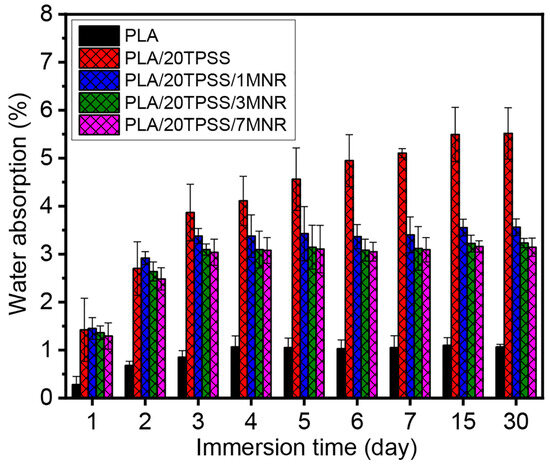 Water absorption of PLA, PLA/20TPSS binary blend, and PLA/20TPSS/MNR ternary blend with various MNR contents (1, 3, and 7 wt.%) at various immersion times.
