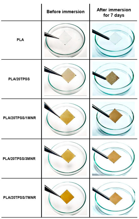 The water resistance of the neat PLA and its blends was assessed in terms of water absorption with time intervals (1 to 30 days), as illustrated in Figure 11. As a result, the water absorption capacity increases with an escalation of immersion times, ultimately levelling off after a certain period. The neat PLA possesses the lowest water absorption capacity, less than approximately 1%, with a stable value after four days throughout the period, indicating that PLA is a low-hydrophilic polymeric material [54,55]. Afterwards, the moisture absorption capacity of the material increases rapidly upward by 3 to 4% by adding the TPSS within the first few days of immersion, involving the effect of the hydrophilic nature of TPSS via the existence of the hydroxyl functional groups available for interaction with the water molecules. Considering the PLA ternary blends, this result indicates that the stable point of moisture absorption value tends to decrease by adding the modified rubber. This can elucidate the impact of the hydrophobic feature of natural rubber-based material added in the PLA/TPSS binary system, resulting in the improved water resistance of the material. Additionally, the physical appearance of sample sheets before and after immersion in the water for 7 days was observed, as presented in Figure 12. As anticipated, the neat PLA still shows a typical transparent sheet, while the binary blend demonstrates the brown spots distributed throughout the sheet, involving the mold growth in the sample after the immersion test. The ternary blends do not show any changes in the sheet’s physical appearance compared to the sample before the immersion test. This phenomenon is consistent with the water absorption capacity of the PLA blend samples.