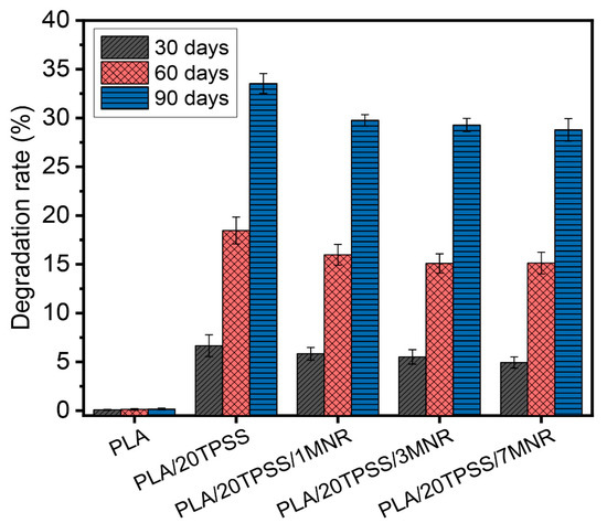 Figure 13 displays the biodegradability of the PLA samples measured by the weight loss after the soil burial test at various times (30, 60 and 90 days). As expected, the neat PLA weight remained constant without any physical change throughout the three months of the soil burial test period, and the degradation rate was elevated with an increment of the soil burial time. The incorporation of 20 wt.% TPSS reveals a rapid increment in the weight loss rate of the PLA binary blends, which are observed at approximately 7%, 18%, and 33% at burial times of 30, 60, and 90 days, respectively. This result is similar to the previous reports in which the PLA/starch blends generally had a higher weight loss rate than the neat PLA [27]. Furthermore, the presence of TPSS as a hydrophilic material can contribute to the moisture diffusion into the PLA matrix, likely resulting in the acceleration of the PLA chains’ hydrolysis [56]. In the cases of the ternary blend system, the addition of MNR in the PLA/20TPSS blend exhibits a slight decline in the degradation rate. This result involves the effect of the hydrophobic nature of the modified rubber added in the binary blend system, causing a slight delay in the degradability of the prepared material; however, the ternary blends in this work showcase the accelerating degradability and improvement in toughness of the prepared material when compared to that of the neat PLA.