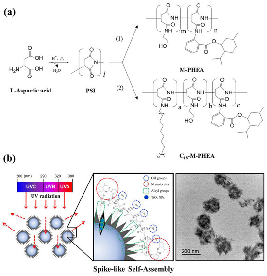 (a) Overall synthesis scheme of (1) M-PHEA and (2) C18-M-PHEA. (b) Schematic representation depicting the formation of spike-like self-assemblies of polyaspartamide integrated with TiO2 nanoparticles designed to enhance UV blocking.