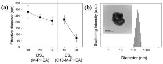 Then, self-assemblies of M-PHEA and C18-M-PHEA were prepared by precipitation and dialysis in aqueous solutions. M-PHEA and C18-M-PHEA copolymers were self-assembled in aqueous solution due to the intra- and/or intermolecular hydrophobic interactions of the grafted hydrophobic segments [19]. The size distribution of the aggregates of M-PHEA and C18-M-PHEA in aqueous solution (0.5 mg/mL) was measured by DLS (dynamic light scattering) (Figure 3). DLS is a non-invasive technique that measures the hydrodynamic diameter of particles in a solution by analyzing the intensity fluctuations in scattered light by the Stokes–Einstein relationship. The effective diameter of the aggregated polymer solution decreased as the DS increased, owing to strong hydrophobic interactions. This result demonstrates that graft copolymer self-aggregation could be affected by the DS of the C18 and MA groups, meaning that a higher DS would lead to smaller aggregates and a lower aggregation number because of stronger hydrophobic interactions and tightly packed hydrophobic domains in the self-aggregates. This is particularly evident when comparing DSM 10 and 20 mol%, as in C18-M-PHEA and M-PHEA, respectively, in which the effective diameter decreased with the increased DS.