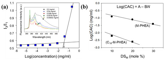 (a) Evaluation of the ratio of third-to-first vibrational fine structure (I3/I1) and emission spectra (λex = 330 nm) of C18-M-PHEA. (b) Determination of the critical aggregation concentration (CAC) for M-PHEA and C18-M-PHEA with varying of DSM (MA).