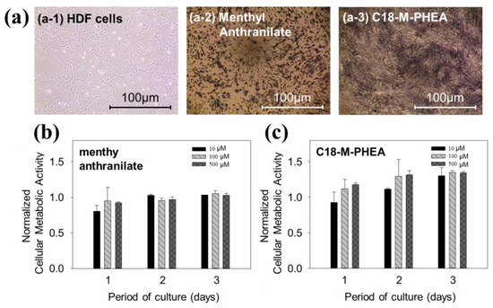 Furthermore, the cellular toxicity of the graft copolymers, M-PHEA and C18-M-PHEA, was found to be significantly lower than that of menthyl anthranilate molecules, as shown in Figure 7. As shown Figure 7b, HDF cells supplemented with MA showed minimal changes in metabolic activities from day 1 to day 3, indicating a stable trend. This observation aligns with the confirmation of slight proliferation in cells at all concentrations. Therefore, to assess the impact of C18-M-PHEA supplementation, comparative experiments were conducted up to day 3, providing insights into the contrasting effects compared to MA supplementation. The results show that the metabolic activities of HDFs supplemented with C18-M-PHEA increased over time at all concentrations (Figure 7c). It is suggested that the graft copolymers have much lower cellular toxicity than short MA molecules, due to biocompatible poly(amino acid)’s derivative backbone and relatively long chains. Moreover, the notable reduction in cellular toxicity observed with the graft copolymers, M-PHEA and C18-M-PHEA, compared to menthyl anthranilate molecules (MA), highlights the biocompatible nature of poly(amino acid)’s derivative backbone. The sustained metabolic activities of HDF cells, even at higher concentrations, suggest the potential of these graft copolymers for biomedical applications. The extended chain length in C18-M-PHEA likely contributes to the observed lower cellular toxicity, emphasizing the advantageous role of relatively long chains in enhancing biocompatibility [20]. This bodes well for the prospect of utilizing these graft copolymers in various biomedical and pharmaceutical contexts.
