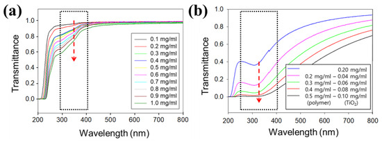 UV-blocking performance. (a) UV transmittance data of C18-M-PHEA (DSM, 20 mol%) versus concentration in the range 0.1–1.0 mg/mL. (b) UV transmittance data for TiO2 encapsulated in C18-M-PHEA (DSM, 20 mol%) at a concentration up to 0.5 mg/mL.