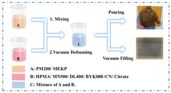 Firstly, the reactor was dried at 80 °C for 3 h, and then the appropriate amounts of polymerized isocyanate MDI (PM200) and initiator methyl ethyl ketone peroxide (MEKP) were added. They were mixed and stirred under nitrogen atmosphere to obtain component A. Secondly, in another dry reactor, appropriate amounts of polyether polyol (DL400, MN 500) and HPMA were added, respectively. Stirring was applied at 80 °C for 30 min then cooled down to 30 °C. Then, appropriate amounts of defoamer BYK088, accelerator cobalt naphthenate (CN) and chelator citrate were added and stirred well to obtain component B. Components A and B were mixed to obtain mixture C and readied for processing. PU was prepared by replacing HPMA with an equal amount of polyol, which was used to form the comparison. The schematic illustration of the fabrication process is shown in Figure 1. The composition of PU samples is shown in Table 1. In order to match the integrity of the reaction, the proportions of the HPMA components were adjusted appropriately. The substrates like pouring molds and glass fiber fabrics used in this work needed to be dehydrated at 60 °C for 120 min before the process. The components involved in the reaction needed to be vacuum dehydrated before the reaction.