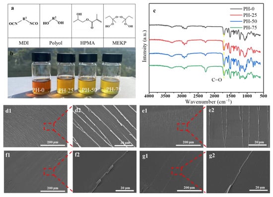 (a) Main compounds related to PU polymerization and radical reaction; (b) photographs of PH-0, PH-25, PH-50 and PH-75 mixtures; the yellow dashed line: C=O bending and vibration peak at 1713 cm−1; (c) ATR–FTIR spectrum of samples; SEM images of PH-0 (d1,d2), PH-25 (e1,e2), PH-50 (f1,f2) and PH-75 (g1,g2).
