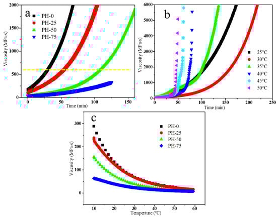 (a) Viscosity curves of different PU copolymers at 25 °C; the yellow hyphen line: viscosity standard (600 MPa·s) for industrial infusion; (b) viscosity curves of PH-50 at different temperatures; (c) viscosity–temperature curves of PU copolymers mixed for 1 min.