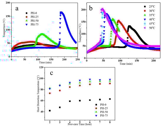 (a) Gel exothermic curves of different PU copolymers at 25 °C; (b) gel exothermic curves of PH-50 under air atmosphere; (c) heat deflection temperature of PU resins at post-cure temperature of 80 °C.
