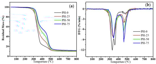 Excellent heat resistance was critical to applicability for PU. The effect of the content of HPMA on the thermal performance of PU samples was studied. Figure 3 shows the results of the TGA and DTG referred to PU copolymers from 35 to 800 °C in nitrogen. The detail data is listed in Table 2. The T5%, T30% and T50% of the PU copolymers increased significantly with increasing HPMA content in Figure 5a. This indicates that the introduction of HPMA improves the thermal stability of the materials []. In addition, the residual mass of the copolymers increased with the addition of HPMA. In detail, the residues of PH-0, PH-25, PH-50 and PH-75 at 800 °C were 10.0 wt%, 9.8 wt%, 10.9 wt% and 11.8 wt% of the initial mass, respectively. The PH-0 sample shows two peaks at 331 and 361 °C in the DTG curve of Figure 5b. All the samples with HPMA show two sharp DTG peaks at approximately 340 and 470 °C, and these can be associated with the thermal disintegration of the matrix. These two characteristic peaks are attributed to the different amounts of PU prepolymer and HPMA. It is believed that the addition of HPMA has a good effect on the thermal stability and residual mass of the PU copolymers under an inert atmosphere.