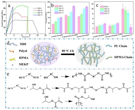 In order to verify the mechanical performance of PU copolymers, we investigated the mechanical properties of the pouring samples at room temperature. The test data are shown in Figure 6a–c, and the results are listed in Table 3. The stress–strain curves of various PU samples are shown in Figure 6a. Obviously, the PU has the highest elongation of 10.02% but the lowest tensile strength of all samples. From these data, it can be seen that the tensile strength, compression strength, bending strength and tensile modulus PU copolymers are significantly better than PH-0. Among these samples, the mechanical properties of PH-50 are the most excellent in these tests. The reinforcement of poly-HPMA to the PU is mainly attributed to the continuous cross-linking structure formed in the matrix shown in Figure 6d. The cross-linked network will limit the deformation of the matrix, making the copolymer strength and modulus have a significant increase compared to PH-0. However, this network structure is unable to withstand large strains, leading to reduced elongation. The chemical reaction formulae for PU reaction and free radical polymerization are also shown in Figure 6d. Specifically, except for the reaction between MDI and polyol that forms polyurethane chains, the isocyanate groups also react with the hydroxyl groups of HPMA in a capping reaction. At the same time, when the reaction system is heated or warmed, HPMA can react with free radical polymerization under the effect of a thermal initiator, MEKP, to form a number of poly-HPMA chains with dense cross-linking structures. In general, the addition of radical polymerization remarkably enhances the strength of the PU, indirectly improving the reliability of the PU copolymers.