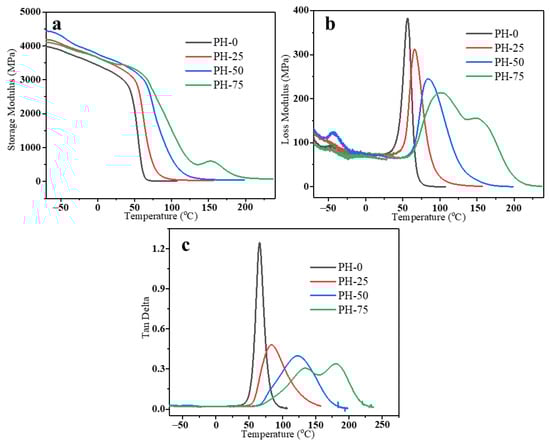 To further elucidate the network structure influence on dynamic stiffening, we also looked into the DMA data obtained at 1 Hz for PH-0, PH-25, PH-50 and PH-75 samples, as shown in Figure 7. In general, the storage modulus is usually related to the elasticity of the material, and it can be used to evaluate the load-carrying capacity and stiffness. In most cases, the strorage modulus of polymers depend on temperature, molecular chain structure and chain segment interactions [,]. Figure 7a shows that the storage modulus of the PU samples increased with an increase of HPMA content. This could be attributed to the increase in rigidity caused by the increase of HPMA and the motion limitation of the network structure. All the samples decreased continuously with increasing temperature, primarily due to the softening of the PU chains at elevated temperatures. Additionally, the storage modulus of the PH-75 sample increased slightly with the temperature rising to 155 °C. This may be due to the excess HPMA, in addition to polymerizing MDI, self-polymerizing to form a molecular chain and blend with the PU. The loss modulus is usually related to the viscosity of the material, and it can reflect the motion of the polymer chains as well as the damping due to energy dissipation. The variations of loss molulus for the PU samples as a function of temperature are shown in Figure 7b. The loss modulus of the PU copolymers containing HPMA decreased across the range of temperatures tested in comparison to that of the neat PU, which mainly resulted from the increasing of cross-linked network structure formation []. This network structure is not favourable for stress transmission, leading to a decrease in the loss modulus of the PU samples. The loss factor, tan delta, is the ratio of the loss modulus to the storage modulus, which usually provides key information about the mechanical properties of the composite. The glass transition temperature (Tg) of the polymer is mainly related to the delayed relaxation induced by the coordinated segmental motion of the polymer chains, which can be expressed as the temperature corresponding to the peak in the tan delta curve. As shown in Figure 7c, the Tg of PH-0, PH-25, PH-50 and PH-75 are 66, 84, 124 and 134 °C, respectively. The increase in Tg values with increasing HPMA concentration could be mainly attributed to the network structure that limited the mobility of the PU chains. In addition, it was clearly seen that the peak value of tan delta for PU-HPMA decreased, suggesting that the PU chains’ mobility decreased after being doped with HPMA.