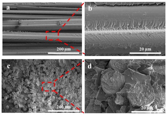 Cross-section SEM micrographs of PH-50/E7-UD1200 composite (a,b) in the 90° direction and (c,d) in the 0° direction.