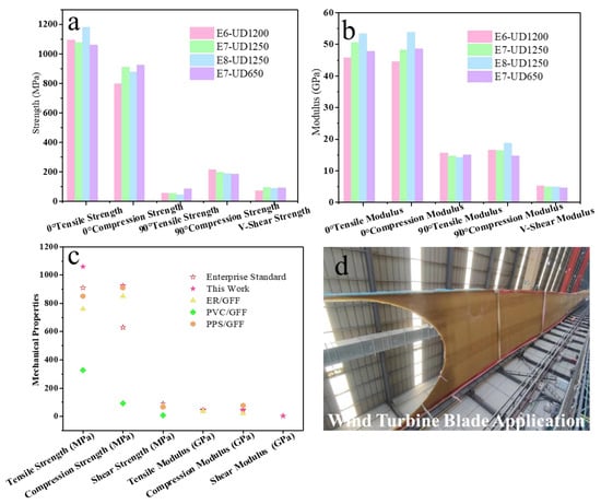 In order to further verify the comprehensive performance of the vacuum-infused PH-50/GFF composites, the mechanical properties of the samples are tested using the material testing machine. The results of the strength, modulus and strain of the PH-50/GFF composites are shown in Figure 9a,b and Table 4. As shown in Figure 9a, the tensile strengths of all the PU-50/GFF, made from four types of glass fibers fabrics, in the 0° direction (parallel to the glass fiber direction) are above 1000 MPa and, in the 90° direction (perpendicular to the glass fiber direction), are all above 52 MPa. The compression strength in the 0° direction are above 800 MPa and, in the 90° direction, are above 187 MPa. Furthermore, all these composites have high tensile moduli and compression moduli, shown in Figure 9b, which fully meet the current design requirements for wind turbine blades. The mechanical properties of different polymer composites and enterprise standard are shown in Figure 9c and Table 5. The strength and modulus of the PU/GFF composite are higher than that of other polymer composites like epoxy resin (ER), polyvinyl chloride (PVC), polyphenylene sulfide (PPS) and others. The merits of the present composites are extremely high mechanical strength and an excellent modulus, which can meet the requirement of wind turbine blade composites [,,]. The application of PH-50/GFF composites in wind turbine blades is shown in Figure 9d. Different types of PH-50/GFF composites may be applied to different types of wind turbine blades or to different locations on the same blade. Until now, this composite has achieved successful application in a blade type, and the prepared wind turbine blade has gained relevant approvals. We suspect that these composites will be used on a large scale for wind turbine blades in the future.