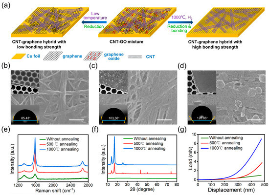 Figure 1a demonstrates the preparation process of the CNT–graphene hybrid. The mixture of CNT and GO dispersion was drop-casted on copper (Cu) foil, followed by annealing in H2 atmosphere. As the common substrate for the CVD growth of graphene [30,32], Cu was selected as the substrate, with its hexagonal crystalline lattice, which is similar to the structure of graphene. Furthermore, the lattice parameter of the (111) plane for Cu is 2.56 Å, which is close to that of graphene (2.46 Å), which favors the epitaxial nucleation and growth of graphene on the Cu surface [33,34]. The low solubility of carbon atoms in Cu also facilitates the control of layer numbers of graphene [30,35]. The high-temperature annealing of the CNT–GO hybrid could not only reduce GO to rGO in situ, but also activate the carbon source to achieve better crystallinity as well as a strong bonding between CNT and graphene in the hybrid [28]. The H2 atmosphere not only plays a major role in the reduction of GO, but also protects the Cu substrate from corrosion at high temperatures, which is indispensable in the annealing process. Within the pristine CNT–GO hybrid, the voids of CNT network were partially covered by GO flakes (Figure 1b). The majority of pores within the network were maintained, through which the hybrid film is transparent under the electron beam (Figure 1b, top inset). After annealing, the porosity of the hybrid decreased dramatically, with the nanotubes tightly bundled together with each other (Figure 1c,d). However, the compactness of the hybrid film increases dramatically with the annealing temperature, resulting in high opaqueness for the electron beam (Figure 1c,d, top inset). The loss of oxygen-containing groups during the annealing process leads to an increase in the hydrophobicity of the hybrid film, As a result, the contact angle of the surface increases from 85.43° in unannealed state to 103.36° with 500 °C annealing and 126.86 for 1000 °C annealing (Figure 1b,d, bottom inset). The thickness of the pristine CNT–GO film is ~1.028 μm, which slightly decreases with 500 °C annealing, and increases a little with 1000 °C annealing (Figure S1). We attributed the change in film thickness to the combined effect of the loss of oxygen-containing functional groups (occuring at a low annealing temperature) and the nucleation and growth of graphene (occuring at a high annealing temperature). Furtherore, we inferred that the film thickness of the film is not changed during the etching of Cu, as the CNT and graphene does not react with FeCl3 etchant.