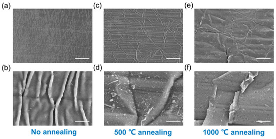 As discussed in previous reports, the CNT network develops wave-like buckles upon cyclic stretching due to its intrinsic flexibility and weak bonding at the nanotube joints [10,26]. The reinforcement of the CNT network by in situ graphene hybridization could enhance the rigidity of the network and restrain the formation of buckles. However, the reinforcement relies on a strong chemical bonding between CNT and graphene, which cannot be achieved by the mechanical mixing of the two components. To investigate the effect of annealing on the bonding strength of CNT and graphene, the morphologies of the as-prepared hybrid before and after annealing under cyclic stretch were compared. For the hybrid of CNT:GO = 45:1 in mass, there is a high density of surface wrinkles perpendicular to the stretching direction after a cyclic tensile strain of 10% (Figure 2a,b), which indicates that the stiffness of the hybrid is mainly dominated by CNTs due to the low graphene ratio and poor CNT–graphene coupling. For the hybrid annealed at 500 °C after cyclic stretching, the density and height of the wrinkles shows a dramatic decrease (Figure 2c,d), and cracks also generate amongst the film (Figure S3), which indicates a higher film stiffness and stronger interaction between CNT and graphene. When the annealing temperature reaches 1000 °C, there are very few folds, with a low amplitude and in random orientation (Figure 2e,f), and the cracks are obviously wider, along with the local delamination from the substrate (Figure 2f), through which the reinforcement effect further improves at such a high temperature. The above result verifies that the CNT network could be effectively reinforced by hybridized graphene after annealing, and a strongly bonded CNT–graphene hybrid could be achieved using this strategy.