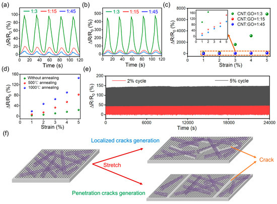 The strain-sensing performance of the CNT–graphene hybrid is investigated based on the CNT–graphene ratio, as well as the effect of annealing. For the hybrid annealed at 1000 °C with initial CNT:GO = 1:3, 1:15 and 1:45, a repeatable and monotonic piezoresistive response to the applied strain is achieved, without abnormal spikes within the small strain range for CNT-based strain sensors, and the sensitivity decreases with the graphene ratio (Figure 3a,b). The gauge factor (GF) value is widely adopted to evaluate the sensitivity of a strain sensor. For the sensors in this work, the electromechanical response is not linear, indicating a GF that varies with strain. Therefore, we used the average GF, which is calculated by dividing the relative resistance change (ΔR/R0) by the applied strain (ε), to describe the sensitivity of the strain sensors [43,44]. The average GF of the CNT:GO = 1:3, 1:15 and 1:45 hybrid for 5% strain is 1399, 29.16 and 20.34, respectively (Figure 3c), which is comparable to the state-of-the-art carbon-nanomaterials-based strain sensors [45,46,47]. On the other hand, the strain-sensing performance of the hybrids with CNT:GO = 1:15 before annealing, after 500 °C annealing, and after 1000 °C annealing were also compared (Figure 3d), with the electrical response to strain increasing with annealing temperature. Also, the durability of the sensor was investigated by the repeated loading of 2% and 5% tensile strains 1000 times. The electrical response is rather stable during the cycles, indicating the high cyclic stability of the sensor (Figure 3e). The effect of annealing on the strain-sensing properties could be attributed to the tendency of crack generation and propagation due to the increased film stiffness (Figure 3f). Before annealing, CNT and GO loosely overlap, with a strong tendency toward interfacial sliding upon stretch. The cracks are usually generated locally at the CNT/GO interface, which is short and narrow (Figure S4a), leading to a small increase in resistance. The stiff CNT–graphene hybrid usually develops sharp penetration cracks upon stretching after annealing, validated by the pullout of CNTs at the fracture surface (Figure S4b) [48]. The crack generation process upon stretch is the underlying reason for the non-linear electromechanical response [49,50]. Additionally, the reliance of average GF on the initial CNT–GO ratio, as well as the annealing temperature, applies to all samples in our work (Table S1). Therefore, through tuning the initial CNT/GO content and setting the annealing temperature, the strain-sensing properties of the hybrid film could be facilely tailored, which could fulfill the requirements for different application scenarios.