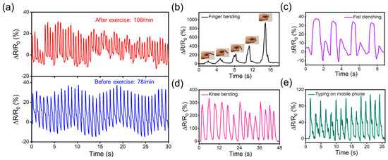 Owing to the excellent strain sensing performance of the CNT–graphene hybrid, it can be applied to capture various bio-signals of human beings when mounted on skin. Since the skin and CNT–graphene hybrid film were separated by the insulated PDMS substrate, the sensor’s signal could only be induced from the strain through the deformation of skin, without the influence of bioimpedance and bioelectricity. The CNT–graphene-hybrid-based strain sensor was attached to the radial artery of a 25-year-old male adult to record the wrist pulse. The sample with CNT:GO = 1:3 was used, as it had the highest sensitivity and could catch the faint pulse signal. When the tester is in a resting state, a highly repeatable pulse waveform was recorded during the 30 s testing, with the heart rate determined to be 78 min−1. Notably, both the percussion (P-) and tidal (T-) wave could be clearly identified, validating the high resolution of the strain sensor and its ability to catch small deformations (Figure 4a). On the other hand, after the tester did some exercise, the heart rate dramatically increased to 108 min−1 from the real-time resistance recording. Furthermore, the pulse amplitude dramatically fluctuates with a blurred T-wave, which is similar to previous reports [3]. The recording of an arterial pulse at a high resolution shows that our sensor has high potential in wearable healthcare. In addition, the sensor could also be tied to the finger pulp to catch the fingertip pulse, which induces much less skin deformation compared to the wrist pulse [51,52] (Figure S5). The heart rate caluclated from the real-time resistance recording agrees with that measured by the smart watch. For the monitoring of muscle and joint motions, which induces dramatically higher deformation, the sample with CNT:GO = 1:15 was adopted due to its adequate sensitivity and low tendency to generate cracks. When the sensor was attached to the proximal interphalangeal (PIP) joint of the index finger, the piezoresistive response monotonically increases with the bending angle of the finger (Figure 4b). Furthermore, the sensor could be adhered onto the back of the hand (Figure S6a). When the tester clenched his fist, the skin on the hand back was stretched, and a characteristic waveform was generated. This waveform is highly repeatable during multiple clenching–relaxation cycles (Figure 4c). Furthermore, the sensor could also reliably catch the large deformation at the knee joint (Figure S6b), with the film resistance increasing several times upon knee-bending, and returning to the original state when the knee is straightened (Figure 4d). The sensor could also record the tapping of a mobile phone by the thumb when adhered to the first dorsal interossei muscle on hand (Figure S6c). Each tapping process generated a spike, with the amplitude and waveform varying based on the tapping force and modes (Figure 4e). Based on the results presented above, the CNT–graphene hybrid develped by our strategy is capable of recording full-range human activities at a high resolution, which makes it promising in biomedical monitoring and human–machine-interaction applications.