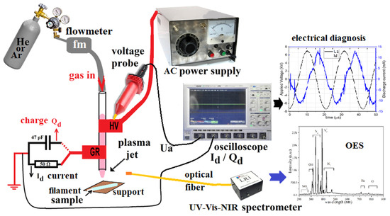 In this experiment, one electrode was linked to the power cord of the power supply, namely the high voltage electrode (HV). The second electrode was connected to the ground, serving as the grounded electrode (Gr). Both electrodes were wrapped around the outer surface of the quartz tube, following a similar approach as that previously described in references [18,21,22,23]. The discharge was initiated using a power supply (PVM500, Information Unlimited, Amherst, MH, USA) capable of generating a voltage range of 1 to 40 kV, a frequency range of 20 to 70 kHz, and an adjustable power output of 10 to 300 W. This power supply allowed for the independent control of voltage, current, and frequency. The applied sinusoidal voltage Ua (up to 18 kV p e a k t o p e a k , at a repetition rate of 48 kHz) and the total current of the discharge Id, were monitored using voltage and current probes (high-voltage probe Caltest CT4028, Cal Test Electronics Inc. (Yorba Linda, CA, USA), voltage probe Lecroy PP006A (Chestnut Ridge, NY, USA), wideband current monitor Pearson 150 (Palo Alto, CA, USA), 50 Ω charge resistor, a 47 pF charge capacitor), and a 1 GHz digital oscilloscope (Lecroy WaveSurfer 104Xs, four channels, 2.5 GS/s, Chestnut Ridge, NY, USA). The experimental setup involved the utilization of pure helium and pure argon (He 5.0 and Ar 5.0, Siad Romania, Bucharest, Romania) as the working gases. These gases were introduced into the discharge quartz tube at a constant flow rate of 2.0 standard liters per minute (slm) using a needle valve rotameter (0–5 slm Platon NGVS312 series, CT Platon, Saint Etienne, France). The spectral emission of the discharge in the ultraviolet-visible-near-infrared (UV-Vis-NIR) range of wavelengths from 200 to 1100 nm was analyzed using an LR1 broad range spectrometer (ASEQ Instruments, Vancouver, BC, Canada). The spectrometer consisted of a monochromator with a 50 μm entrance slit, a 600 gr/mm diffraction grating blazed at 300 nm, and a CCD (Toshiba TCD1304DG linear array) detector. The spectrometer was connected to a 0.4 mm diameter and 1 m long kevlar-reinforced and cosine-corrected optical fiber (Thorlabs, Newton, NJ, USA), which was designed for wavelengths ranging from 200 to 1200 nm. It was positioned at a distance of 5 mm from the plasma.