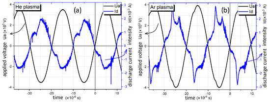 Figure 2. The voltage–current waveform of the discharge being studied and used for polymer treatment, ignited in (a) He and (b) in Ar.