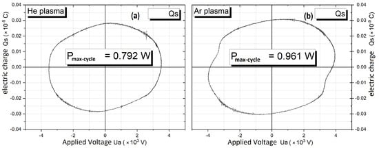 Figure 3. The charge–voltage waveform, Lissajous figure, of the discharge being studied, ignited in (a) He and (b) in Ar, used for power estimation.