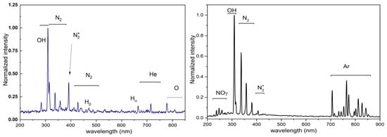 Figure 4 illustrates that the plasma source utilized in this investigation possesses sufficient energy to stimulate not only the working gas lines, but also the lines and bands of other atmospheric species, including NO γ , OH, N 2 , N 2 + , and O, in addition to helium or argon lines. The reactive species of nitrogen and oxygen (RNS and ROS), commonly referred to as such, have the potential to exert a substantial influence on the interaction between the plasma and the sample surface.