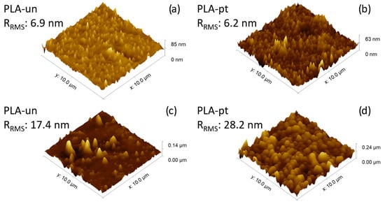 AFM morphology pictures were obtained for each sample using a 10 µm × 10 µm scanning region. The imaging process was performed at various locations on the polymer sample to ensure the reproducibility of the data. The obtained results are primarily limited to three-dimensional photographs of the original and modified polymer surfaces (Figure 5). Statistical atomic force microscopy (AFM) estimations allowed for the characterization and comparison of surface roughness using the root mean square roughness ( R R M S ), both before and after the treatment. The root mean square roughness ( R R M S ) of pristine PLA filaments is 6.9 nm, whereas for the pristine 3D printed filaments it is 17.4 nm. The R R M S value for the plasma-treated filament sample is 6.2 nm, while for the plasma-treated and 3D-printed sample it is 28.2 nm. By examining the 3D images in Figure 5, it is evident that the morphology and roughness of the PLA samples have undergone noticeable alterations, both after plasma treatment, 3D printing, and the combination of these two processes. This phenomenon may be attributed to the reorganization mechanisms of PLA chains taking place at the surface of the polymer, maybe accompanied by crosslinking or bond cleavage reactions. The plasma exposure induces a ’smoothing’ process and uniform reorganization of the peaks on the surface, which can improve the contact angle between PLA and any gas, liquid, or solid it comes into contact with. This has the potential to boost adhesion for the surfaces treated with plasma. In order to support this assumption, it is necessary to employ further characterization techniques such as FTIR, SEM, CA, or XPS.