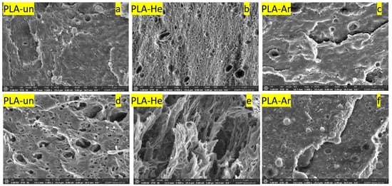 Figure 6. SEM images of the PLA samples cross-sections after liquid nitrogen fracture (ac) and after mechanical stretching (df), for untreated (un) and plasma exposure (in He or Ar).