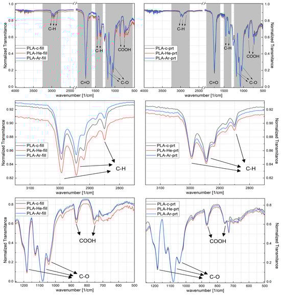 According to Vasanthan et al. [48], in the wavenumber region between 600 and 1000 cm 1 , there are the bands corresponding to the crystalline (around 920–921 cm 1 ) and amorphous state of PLA (≈955–956 cm 1 ). Moreover, Vasanthan also monitored some band in the 2800–3200 cm 1 (2996, 2961 and 2945 cm 1 ) that have evolutions related to the polymer crystalline state. It was observed that the helium plasma treatment of PLA induced the most pronounced effect to be seen in the FTIR spectra. As expected, due to the fact that the PLA filament was subject to plasma exposure and after that subjected to the 3D printing process, the effects were pronounced for the spectra obtained for it; as can be seen in Figure 8 on the left side, from top to bottom, the full range and representative regions for the C–H, C–O, and COOH. The main hypothesis here is that, after plasma exposure, the surface of the PLA comes into contact with more reactive oxygen species, so slight modifications of the C–O and COOH regions are to be encountered. Nevertheless, some modifications are also observed for the PLA exposed to argon plasma, but with less intensity. Nonetheless, these results suggest that, for the conditions presented in this report, plasma treatment mostly affects the surface rather than the bulk of the material. Furthermore, the 3D printing process may be seen as an annealing process, leading to an augmentation in the degree of crystallinity of the polymers. However, the plasma treatments continue to have noticeable effects even after the polymer is printed, indicating that the plasma effects are quite persistent during the 3D printing process.