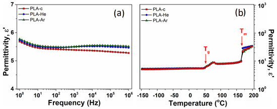 Figure 9. The evolution of dielectric permittivity with frequency at room temperature for untreated PLA-c and plasma treated PLA-He, PLA-Ar samples (a). To the right, the evolution of dielectric permittivity with a temperature at 1 kHz for untreated PLA-c and plasma treated PLA-He, PLA-Ar samples (b). The T g and T m points are marked with arrows.