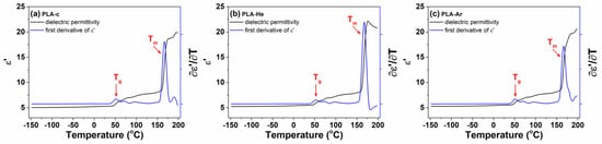 Figure 10. The evolution of dielectric permittivity and the first derivative of permittivity versus temperature for simple PLA-c (a) and treated PLA-He (b) and PLA-Ar (c) samples. The dielectric spectra are selected at 1 MHz. The T g and T m points are marked with arrows.