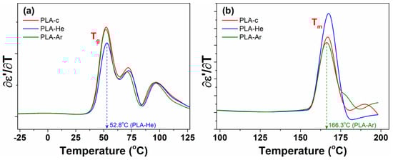 Figure 11. First derivative of permittivity versus temperature for simple PLA-c, PLA-He, and PLA-Ar in the temperature regions of T g (a) and T m (b). The arrows indicate the numerical values of T g and T m exemplarily for PLA-He and PLA-Ar, respectively.