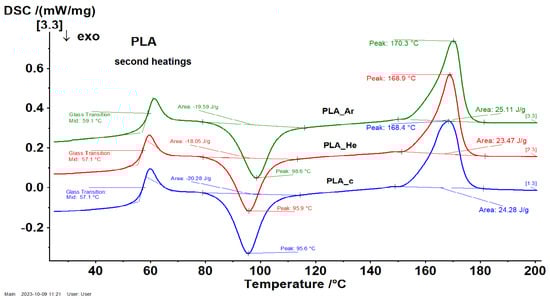 DSC measurements were performed over two heating regimes and a cooling phase. The first heating regime was performed for erasing the thermal history of samples within the temperature range of 25 °C to 200 °C. Subsequently, the samples underwent a cooling process from the melt state to 25 °C. Finally, a second heating cycle was performed, spanning temperatures from 25 °C up to 200 °C. Figure 12 here presents the DSC curves of the series of 3D-printed PLA samples, during the second heating cycle of measurements. Notably, no exothermal peaks, such as crystallization, were detected during the cooling phase, indicating that all the investigated samples remained entirely amorphous. Following the second heating regime, the main thermal events for the untreated PLA-c sample were identified. These include the glass transition step ( T g ) at approximately 51.6 °C, the cold crystallization exothermic peak ( T c c ) at 103.7 °C, and a two-step melting process ( T m ) at 148.7 °C and 164.9 °C. The temperature values associated with these thermal processes during the second heating cycle for all investigated samples are detailed in Table 3. It is noteworthy that the thermal processes, namely T g , T c c , and T m , for plasma-treated samples occurred at higher temperatures compared to those of the untreated PLA sample.