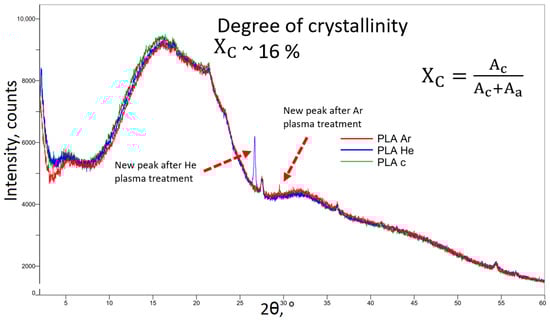 A critical parameter for polymers being processed, by every means, is the degree of crystallinity (or crystallization capacity) X c , which is estimated from the difractograms of the polymeric samples. For pure PLA samples, the X c is around 2.5%, as also reported in [46,50], and it increases after plasma treatment up to 16%, as seen in Figure 13.