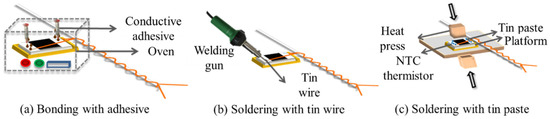 The NTC thermistor and the enameled copper wires were connected by soldering the lead-free tin wire with a 30 W Internal Heat Welding Gun at high temperature with reference to previous work [19], as depicted in Figure 2b.