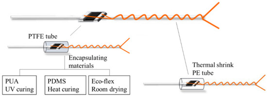 The encapsulated interconnection area of the NTC thermistor and enameled copper wire should be minimized to maintain flexibility and invisibility and improve the wearable comfort of the integrated product. Therefore, a transparent and hollow polytetrafluoroethylene (PTFE) tube with an outer diameter of 1.4 mm and length of 2 mm (Jinda fluorine plastic Co., Ltd., Wenzhou, China) was selected as the encapsulating mold in this experiment. Additionally, the PTFE tube was easily demolded after curing. The UV-curing polyurethane acrylate (PUA) [17], thermal-curing polydimethicone (PDMS with prepolymers: hardeners, 10:1) [20], and silicone Eco-flex (silicone resin: platinum, 1:1) were used as the encapsulation material, respectively. Firstly, the interconnection area of the NTC thermistor and wire was covered using the PTFE tube; then, different encapsulation materials were injected into the PTFE tube and cured accordingly: PUA was cured for 40 s under UV light (xenon lamp, 1700 w); the PDMS solution was heated at 80 °C for 1 h in an oven; and Eco-flex was dried horizontally at room temperature (25 °C, 65%RH) for 30 min.