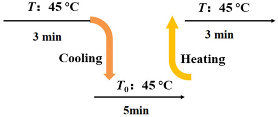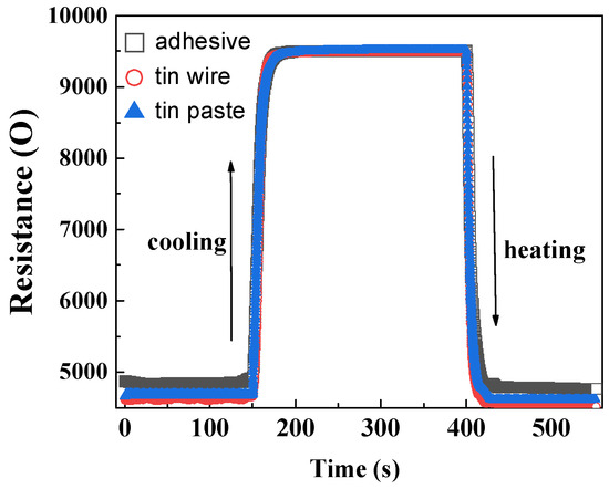 The response time was usually utilized to indicate the response speed of HETS yarn to temperature variations, representing the duration required for it to reach a stable final value [7]. Generally, it refers to the time taken by the temperature sensor for a 63.2% change in temperature [23]. In this experiment, the response time was measured using the testing procedure depicted in Figure 4. The resistance changes were recorded following heating and natural cooling processes under a frequency of 1.0 kHz, with six repeated tests conducted on each sample. Five samples were prepared using different interconnection methods, and their average values were calculated.